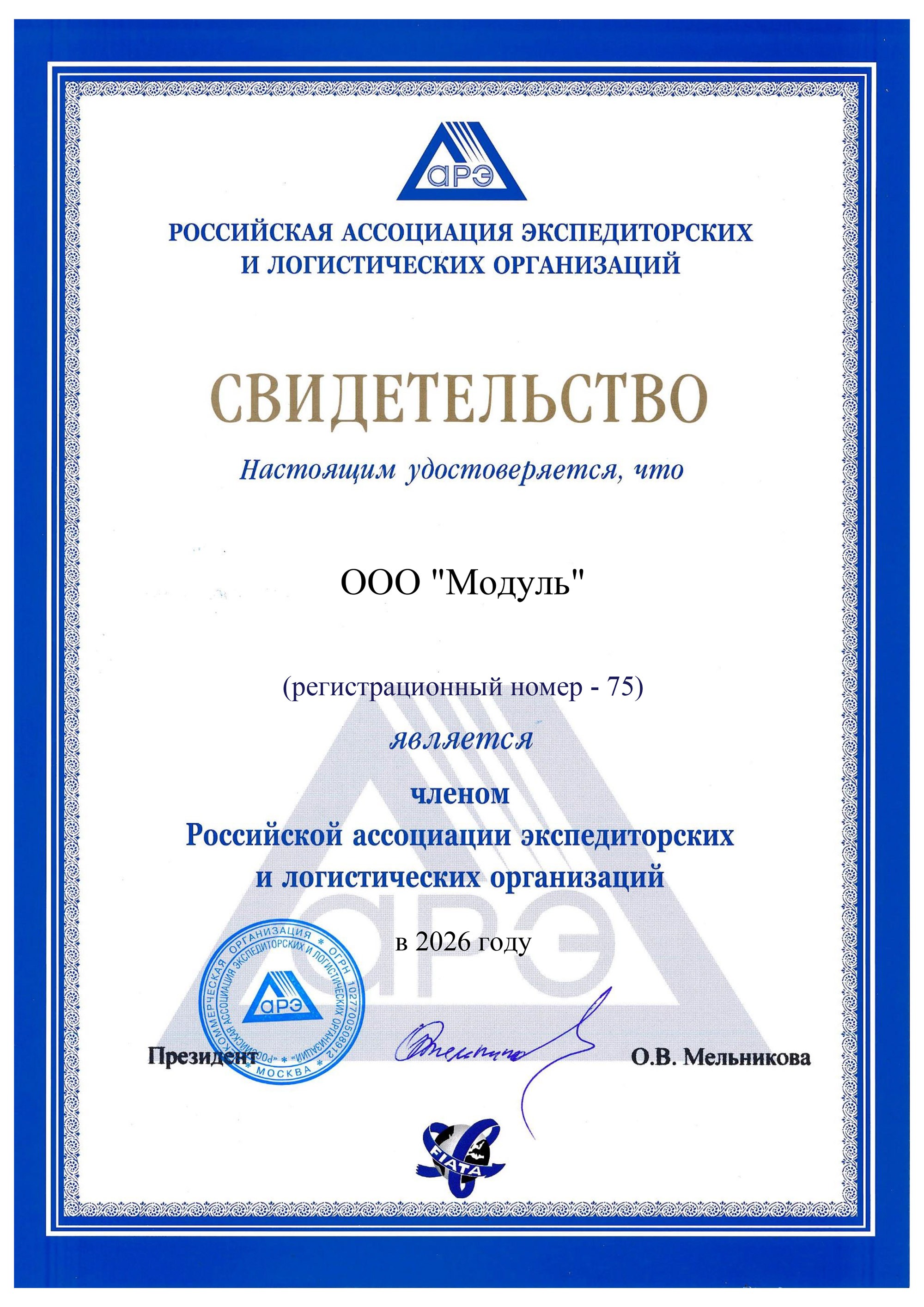 Certificate on entry of Modul Auto Co. Ltd into the Register of Bonded Carriers issued by Federal Customs Service